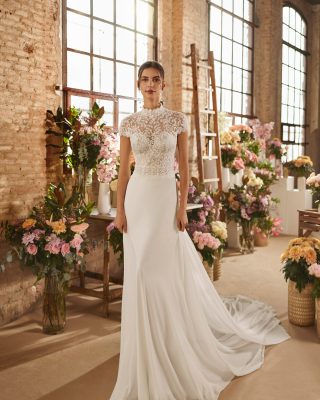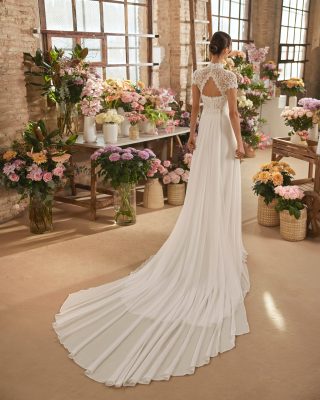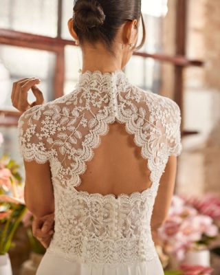 Poročna obleka Xelena ima lahkotno krilo iz svilenega šifona. Ramena so pokrita s čipko. Visok ovratnik in kratki rokavčki iz prosojne čipke poudarijo eleganco. Še posebej graciozen je hrbtni izrez.