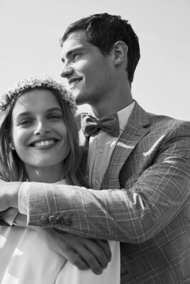 Obleka je izdelana iz lahkotne volnene tkanine, ki je primerna tudi za poletne dni. Karirasta modna poročna obleka se lahko kombinira z enakim telovnikom ali pa brez vzorčnim telovnikom. Lepo se poda metuljček v enaki tkanini. Obleka se lahko nosi tudi brez telovnika, takrat lahko dodamo usnjene naramnice ali pa naramnice iz tkanine.