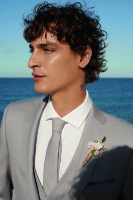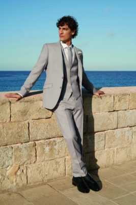 Elegantna svetlo siva moška poročna obleka. Izdelana je iz lahkotne, tanko tkane volnene tkanine. K obleki se poda svečan telovnik s plastronom ali metuljčkom.