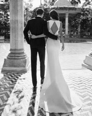Poročna obleka Aina je ženstveno oprijetega kroja brez dodane čipke. Krojena je iz gladkega sijočega satena. Pasek je bleščeče okrašen. Še posebej pa jo definira trapezasto oblikovan hrbtni izrez.