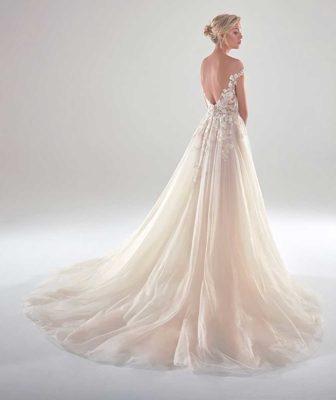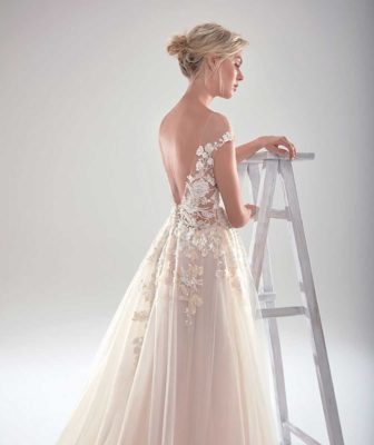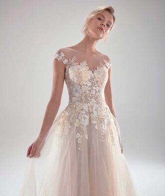 Poročna obleka Amanda je kroja A-linije. Život je izdelan s čipko, ki je v cvetličnem vzorcu. Različnih barvnih odtenkov od smetane pa do nežno pudraste barve. Čipka je nekoliko prosojna, vendar gostota le-te ne dovoljuje pronicanje kože skozenj. Ramena so prekrita s prosojno tkanina, kar dovoljuje, da se delček čipke spušča na konceh ramen in s tem omogoča, da je lahko hrbet globoko izrezan v V linijo. Krilo pa je prosto padajoče. Preprosto čudovita poročna obleka.
