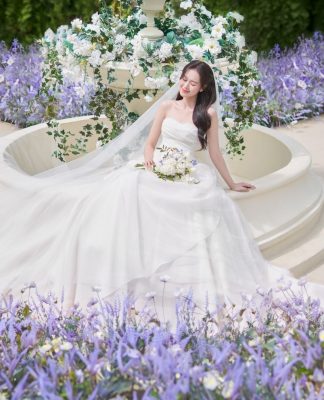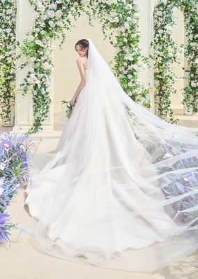 Lahkotna poročna obleka Beatrice A-linije je izdelana iz lahkotnega tila. Drapiran til se ovija okrog životca, tilasto krilo pa se v več plasteh nežno spušča do tal. Korzet je brez naramnic, na vašo željo pa vam jih lahko prišijemo.