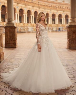 Poročna obleka Kayden v A-liniji. Život je okrašen z drobno čipko, ki se v slapovih spušča po krilu iz lahkotnega tila. Čipkasti dolgi rokavi se lahko odstranijo. Vlečka se po obredu preprosto spne.