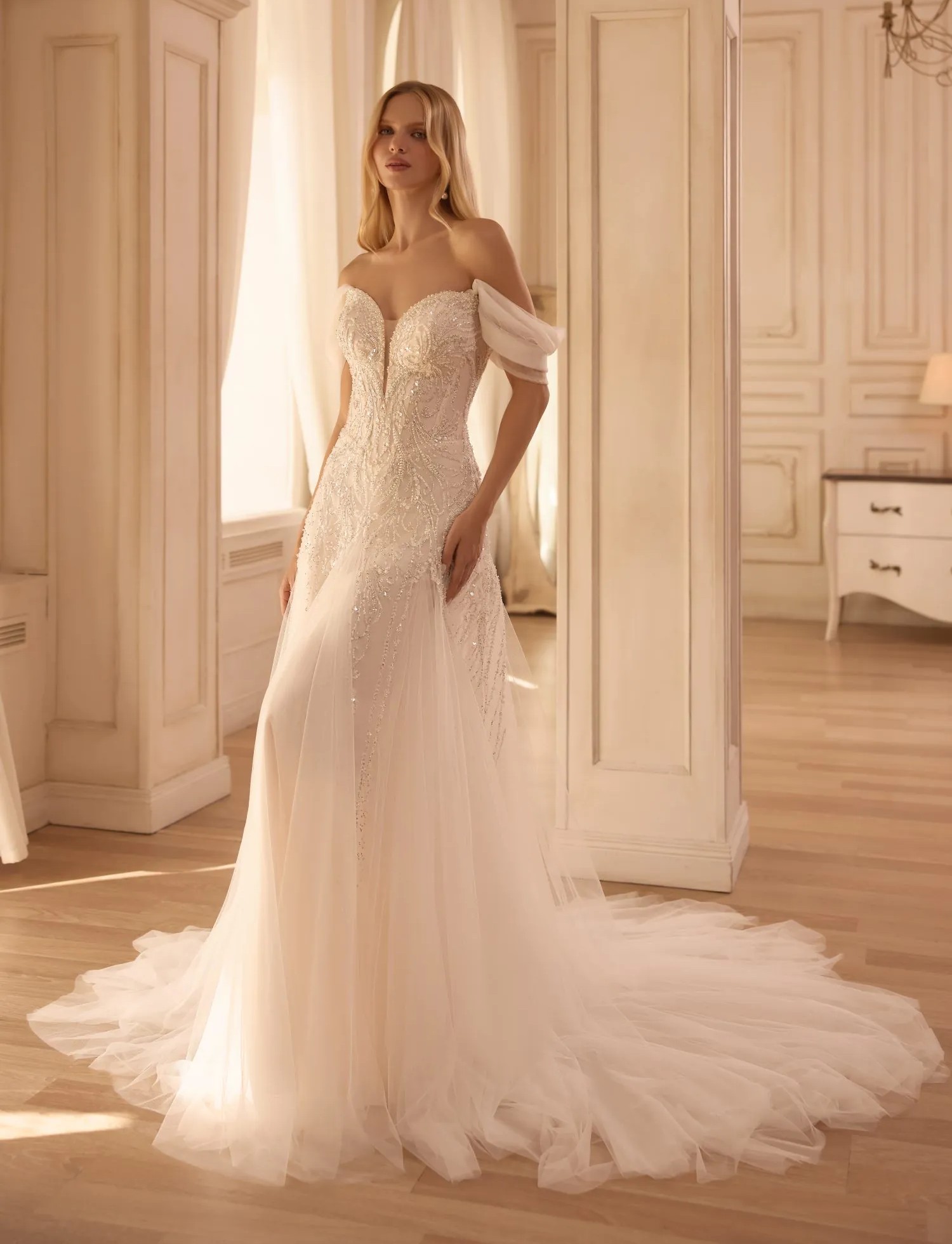 Ekstravagantna poročna obleka Kealin je krojena iz nežne, drobne, vendar pompozne čipke. Oprijeta linija poudari vašo ženstvenost. Sprednji dekolte je estetsko oblikovan v V linijo. Hrbtni izrez pa je osupljivo graciozen in razkriva velik del hrbta. V spodnjem delu krila, se pri gibanju resice nagajivo pozibavajo.