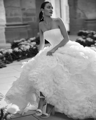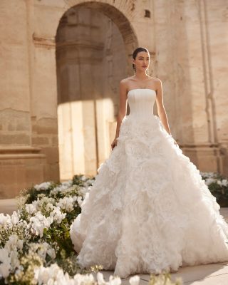 Romantična princes poročna obleka Myla. Strukturiran korzet poudari životec in ozek pas. Razgaljena ramena pri nevesti izžarevajo nežnost in ženstvenost. Na vašo željo, vam naramnice lahko tudi prišijemo. Krilo se bohoti s 3D cvetovi. V tej obleki boste popolnoma očarala ženina in vse svate.