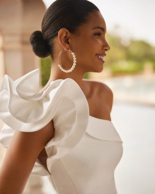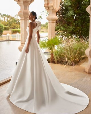 Graciozna poročna obleka Opalo je izdelana iz kraljevega satena. Modno oblikovana ena naramnica, ima pridih španske elegance. Odkrita druga rama poudarja ženstvenost. Krilo v A-liniji objame zgornji del bokov in se širi po celotni dolžini. V krilo so všiti prikupni žepki. Krajša vlečka se lahko pripne, da v obleki lahko poplesavate cel večer.
