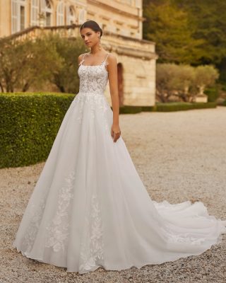 Poročna obleka Verla je prikupna, najlepša, lahkotna obleka. Život krasijo ozke bleščeče naramnice in modno oblikovan dekolte. Krilo je okrašeno s čipko.