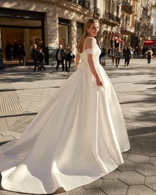 Poročno obleko Wintia krasi čipkast korzet. Ima eleganten sprednji V izrez in čipkaste naramnice, ki se rahlo spuščajo iz ramen. Saten krilo ima prikupne stranske žepke. Poročna obleka je primerna za močnejše postave.