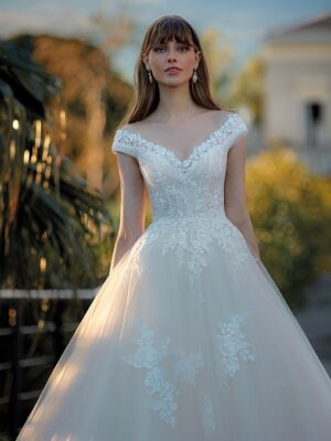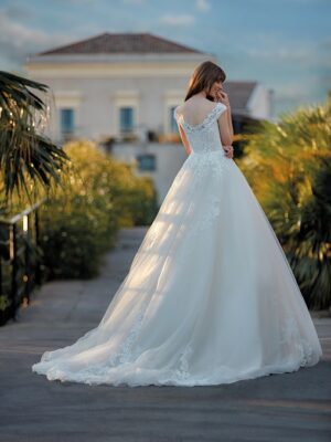 Princes poročna obleka Olite ima čudovit, ženstven, nežen sprednji dekolte, ki se malenkostno spušča na ramena. Dekolte je zaključen s prefinjeno čipko, ki krasi životec in se rahlo spušča tudi po krilu. Vlečka ni dolga in se jo na enostaven način tudi pripne, tako da je krilo enake dolžine tako spredaj, kot tudi zadaj. Torej v obleki lahko plešete in uživate svoj poročni dan.