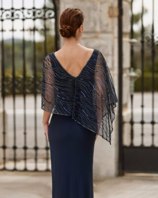 Dolga elegantna obleka z V sprednji izrezom in V hrbtnim izrezom. Životec in roke prekriva modno oblikovana čipka. Kroj je primeren tudi za ne ozke pasove. Priporočamo jo za vsa življenjska praznovanja.