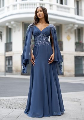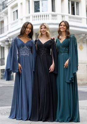 Elegantna svečana obleka Theodora z dolgimi širokimi rokavi, ki so metuljasto krojeni. Široka čipka v životcu poudari ozek pas. Krilo zaradi mehkega šifona lahkotno poplesava ob vašem gibanju. Obleka pristaja tudi močnejšim postavam.