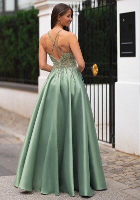 Svečana obleka Zissy je zelo pompozna z bleščečim životcem, ženstveno oblikovanim dekoltejem, hrbtni izrez pa je dih jemajoč. Krojena je iz materiala mikado v olivno zeleni barvi, ki obleko naredi mogočno. Krilo se ponaša s prikupnima žepkoma pri strani.
