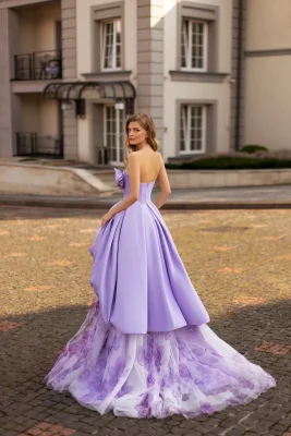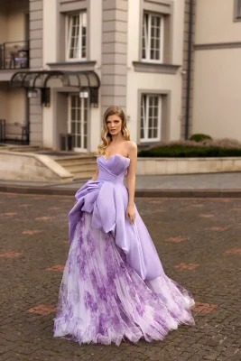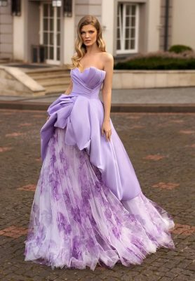 Čudovita ekstravagantna obleka Lizzo v lila barvi. Samostoječi korzet (lahko dodamo naramnice) je modno oblikovan s prepletom gubic. V krilu se poigravata lahkotna vzorčasta organza in kraljevi saten.